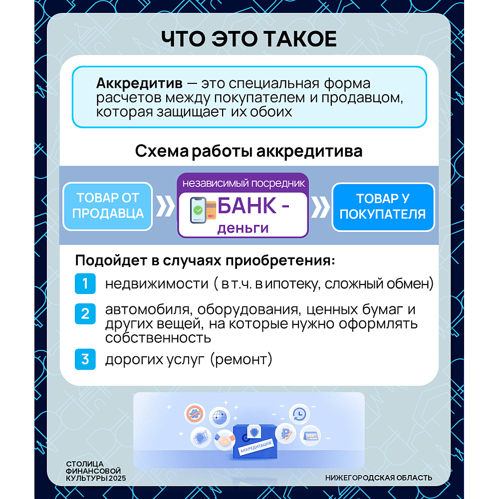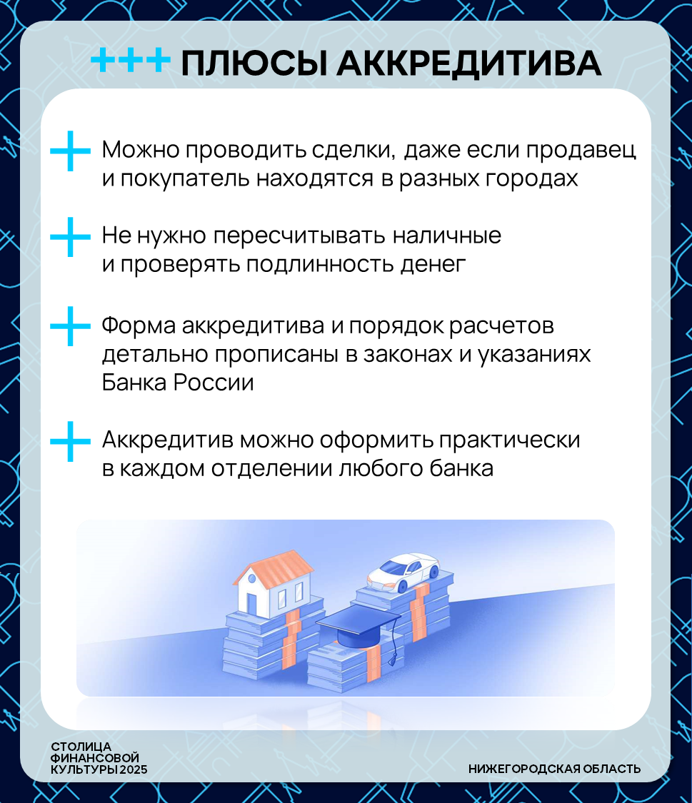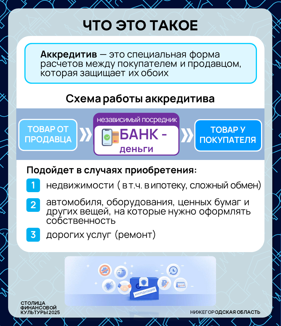 ⚙️ Покупаете квартиру, машину или дорогое оборудование? Не хотите переводить крупную сумму незнакомому человеку? Существует банковский инструмент, который защитит обе стороны сделки — это аккредитив